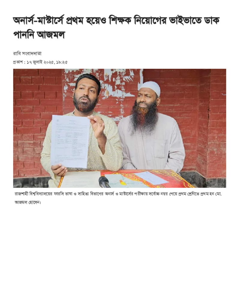 অনার্স-মাস্টার্সে প্রথম হয়েও শিক্ষক নিয়োগের ভাইভাতে ডাক পাননি আজমল.pdf Published on 17 July 2025 Newspaper দৈনিক ইত্তেফাক Category Personal Opinion / Discussion / Commentary General Education Download