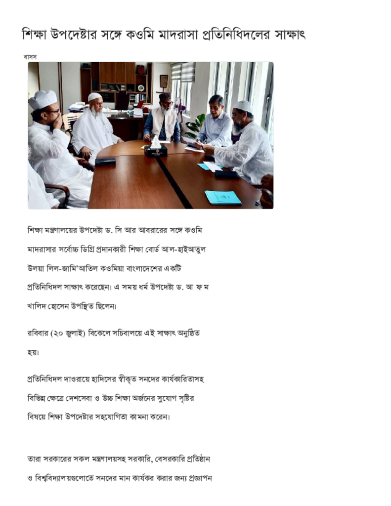 শিক্ষা উপদেষ্টার সঙ্গে কওমি মাদরাসা প্রতিনিধিদলের সাক্ষাৎ.pdf Published on 20 July 2025 Newspaper দৈনিক কালের কন্ঠ Category Madrasah Education Madrasah Education Qawmi Download