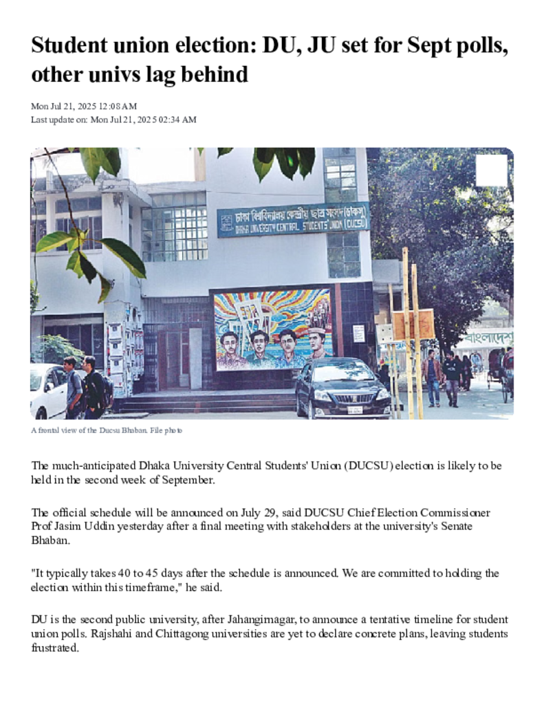 Student union election_ DU, JU set for Sept polls, other univs lag behind.pdf Published on 21 July 2025 Newspaper The Daily Star Category Student Politics General Education Download