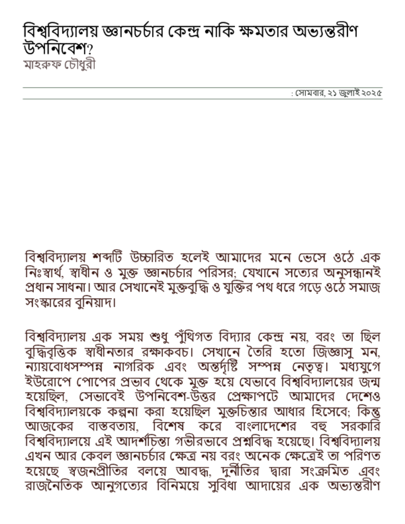 বিশ্ববিদ্যালয় জ্ঞানচর্চার কেন্দ্র নাকি ক্ষমতার অভ্যন্তরীণ উপনিবেশ_ _ সংবাদ অনলাইন.pdf Published on 21 July 2025 Newspaper দৈনিক সংবাদ Category Personal Opinion / Discussion / Commentary Download