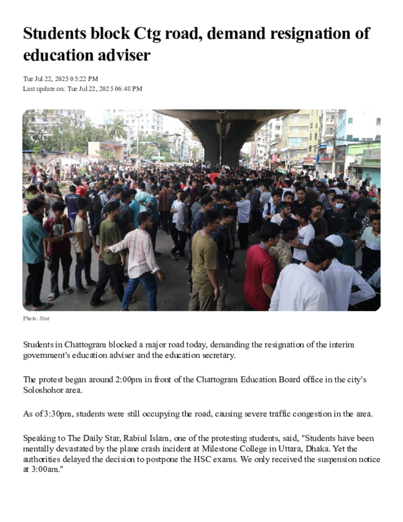 Students block Ctg road, demand resignation of education adviser.pdf Published on 22 July 2025 Newspaper The Daily Star Category Personal Opinion / Discussion / Commentary Download