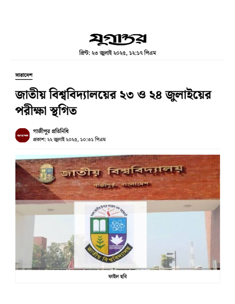 জাতীয় বিশ্ববিদ্যালয়ের ২৩ ও ২৪ জুলাইয়ের পরীক্ষা স্থগিত.pdf Published on 22 July 2025 Newspaper দৈনিক যুগান্তর Category Educational Ministry / Departments General Education Download