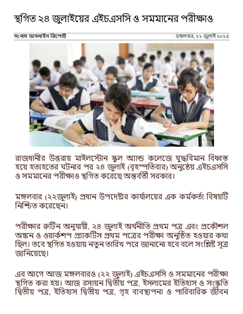 স্থগিত ২৪ জুলাইয়ের এইচএসসি ও সমমানের পরীক্ষাও _ সংবাদ অনলাইন.pdf Published on 22 July 2025 Newspaper দৈনিক সংবাদ Category Public Examination Public Examination HSC Download