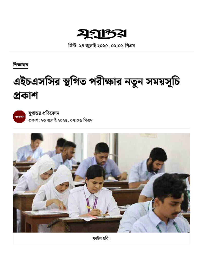 এইচএসসির স্থগিত পরীক্ষার নতুন সময়সূচি প্রকাশ.pdf Published on 23 July 2025 Newspaper দৈনিক যুগান্তর Category Public Examination Public Examination HSC Download