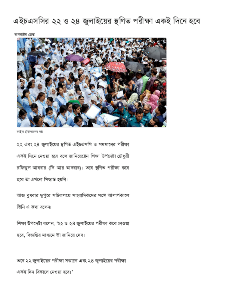 এইচএসসির ২২ ও ২৪ জুলাইয়ের স্থগিত পরীক্ষা একই দিনে হবে.pdf Published on 23 July 2025 Newspaper দৈনিক কালের কন্ঠ Category Educational Ministry / Departments Public Examination HSC Download