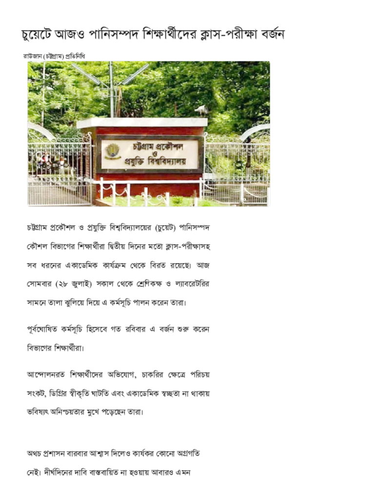 চুয়েটে আজও পানিসম্পদ শিক্ষার্থীদের ক্লাস-পরীক্ষা বর্জন.pdf Published on 28 July 2025 Newspaper দৈনিক কালের কন্ঠ Category Professional Education Professional Education Engineering Download