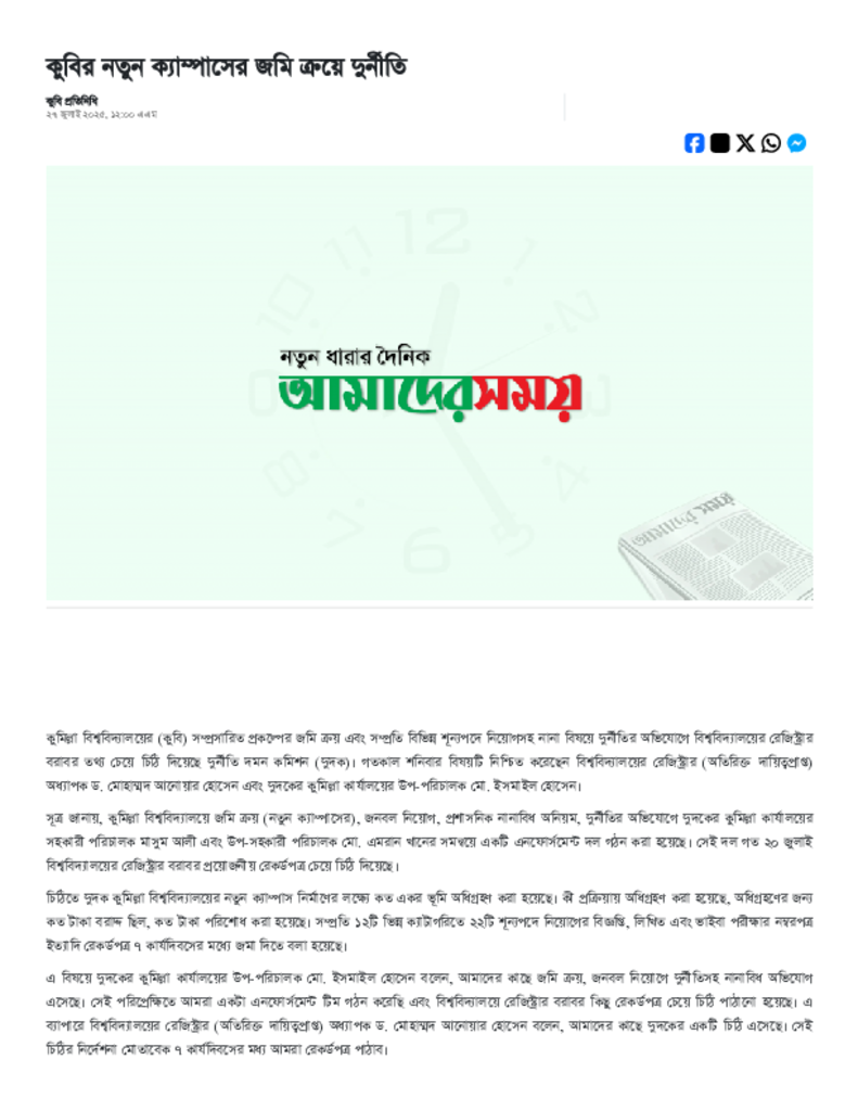 কুবির নতুন ক্যাম্পাসের জমি ক্রয়ে দুর্নীতি.pdf Published on 27 July 2025 Newspaper দৈনিক আমাদের সময় Category Personal Opinion / Discussion / Commentary General Education Download