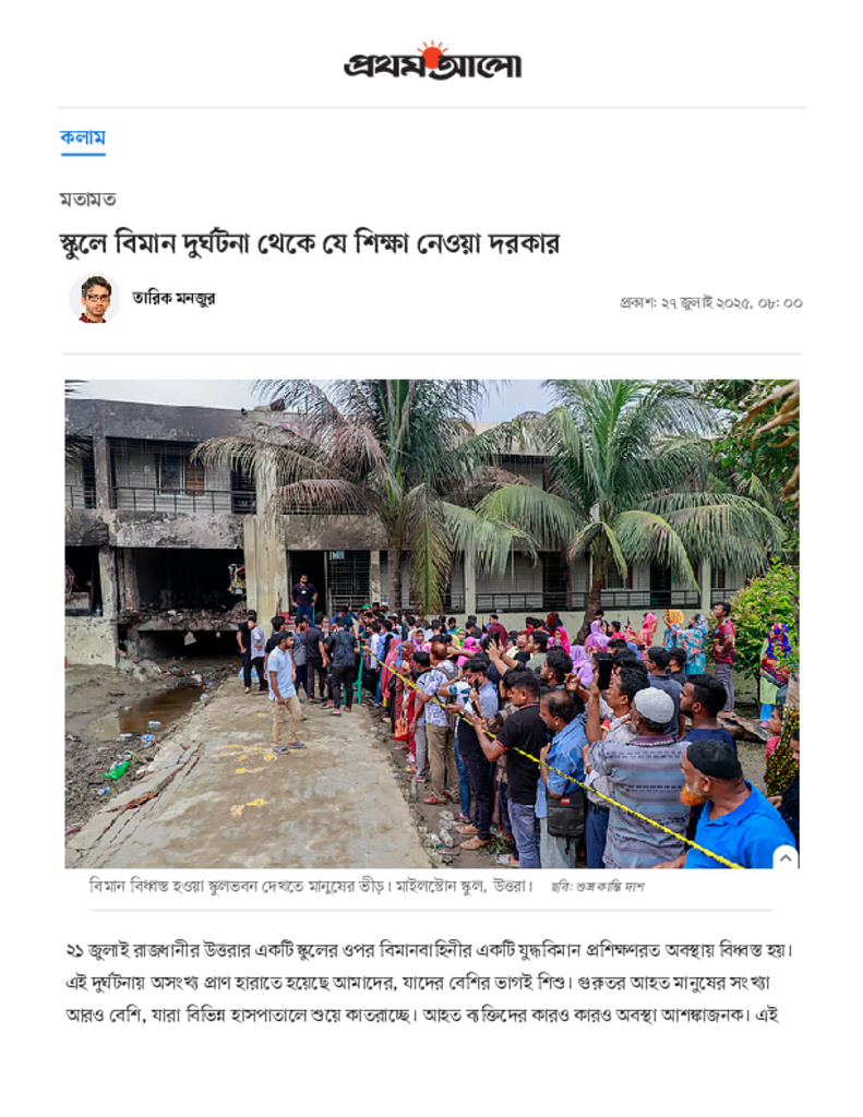 স্কুলে বিমান দুর্ঘটনা থেকে যে শিক্ষা নেওয়া দরকার.pdf Published on 27 July 2025 Newspaper দৈনিক প্রথম আলো Category Personal Opinion / Discussion / Commentary Download