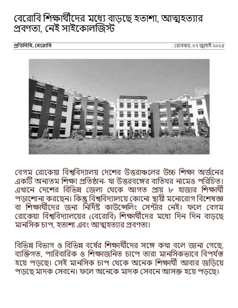 বেরোবি শিক্ষার্থীদের মধ্যে বাড়ছে হতাশা, আত্মহত্যার প্রবণতা, নেই সাইকোলজিস্ট.pdf Published on 27 July 2025 Newspaper দৈনিক সংবাদ Category Personal Opinion / Discussion / Commentary General Education Download