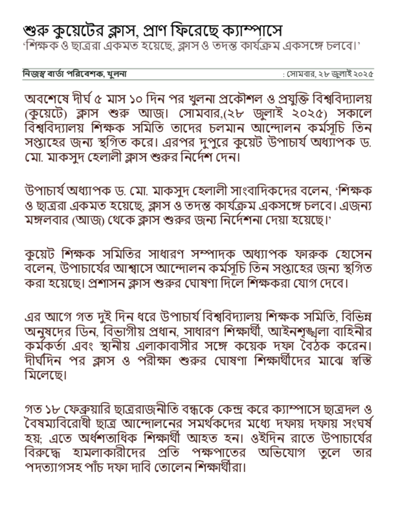 শুরু কুয়েটের ক্লাস, প্রাণ ফিরেছে ক্যাম্পাসে _ সংবাদ অনলাইন.pdf Published on 28 July 2025 Newspaper দৈনিক সংবাদ Category Personal Opinion / Discussion / Commentary Download