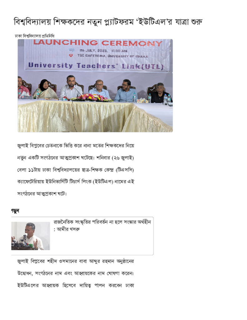 বিশ্ববিদ্যালয় শিক্ষকদের নতুন প্ল্যাটফরম __‘ইউটিএল’র যাত্রা শুরু.pdf Published on 26 July 2025 Newspaper দৈনিক কালের কন্ঠ Category General Education General Education Download