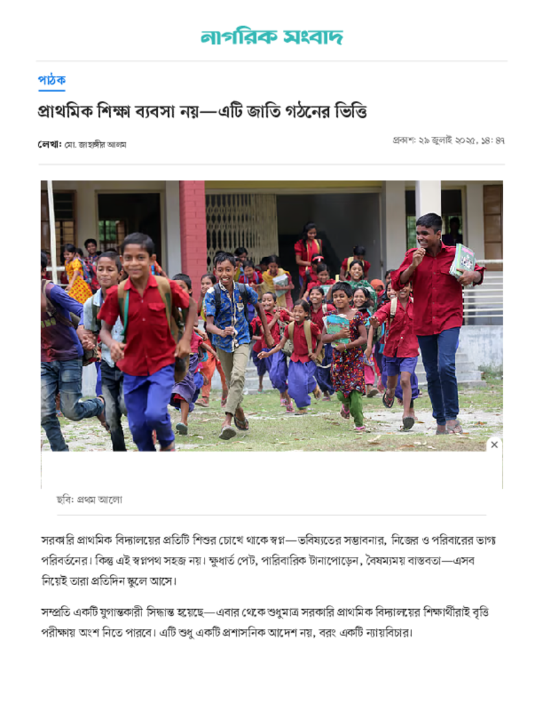 প্রাথমিক শিক্ষা ব্যবসা নয়—এটি জাতি গঠনের ভিত্তি _ নাগরিক সংবাদ.pdf Published on 29 July 2025 Newspaper দৈনিক প্রথম আলো Category Personal Opinion / Discussion / Commentary Download