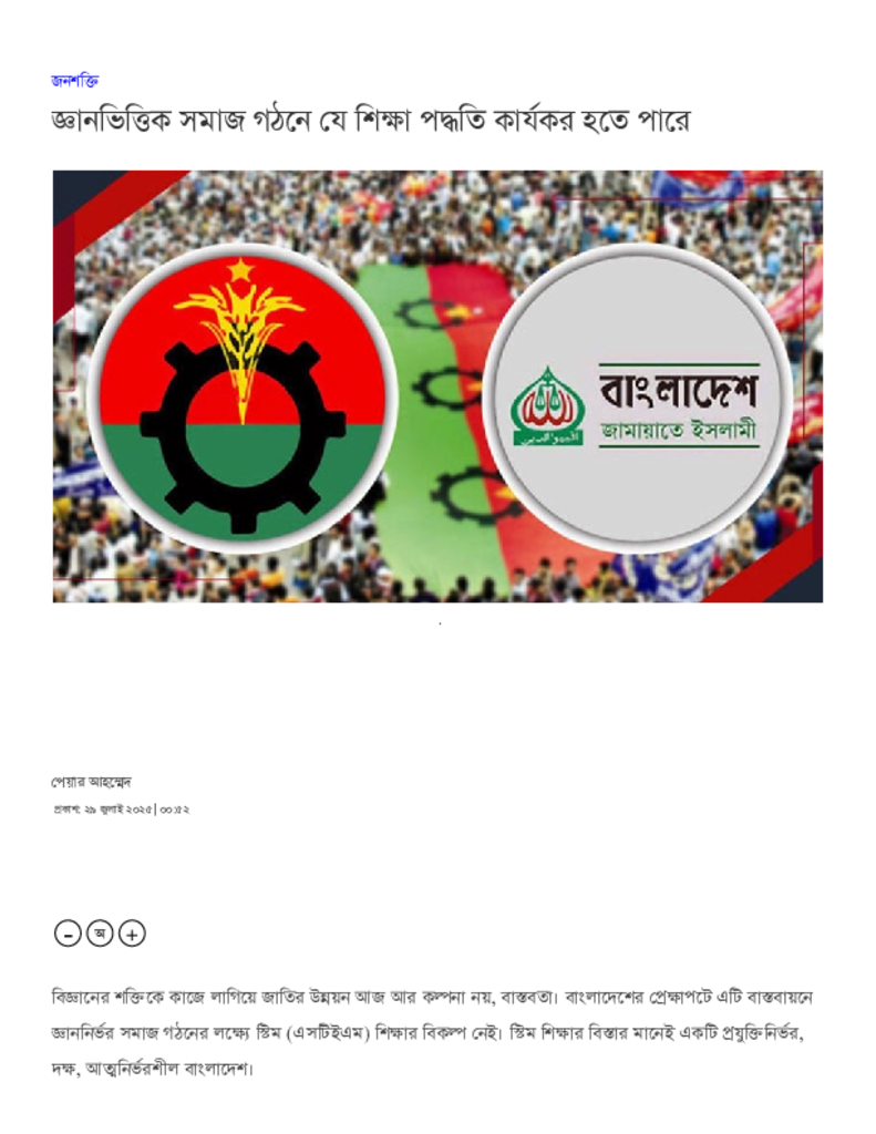 জ্ঞানভিত্তিক সমাজ গঠনে যে শিক্ষা পদ্ধতি কার্যকর হতে পারে.pdf Published on 29 July 2025 Newspaper দৈনিক সমকাল Category Personal Opinion / Discussion / Commentary Download
