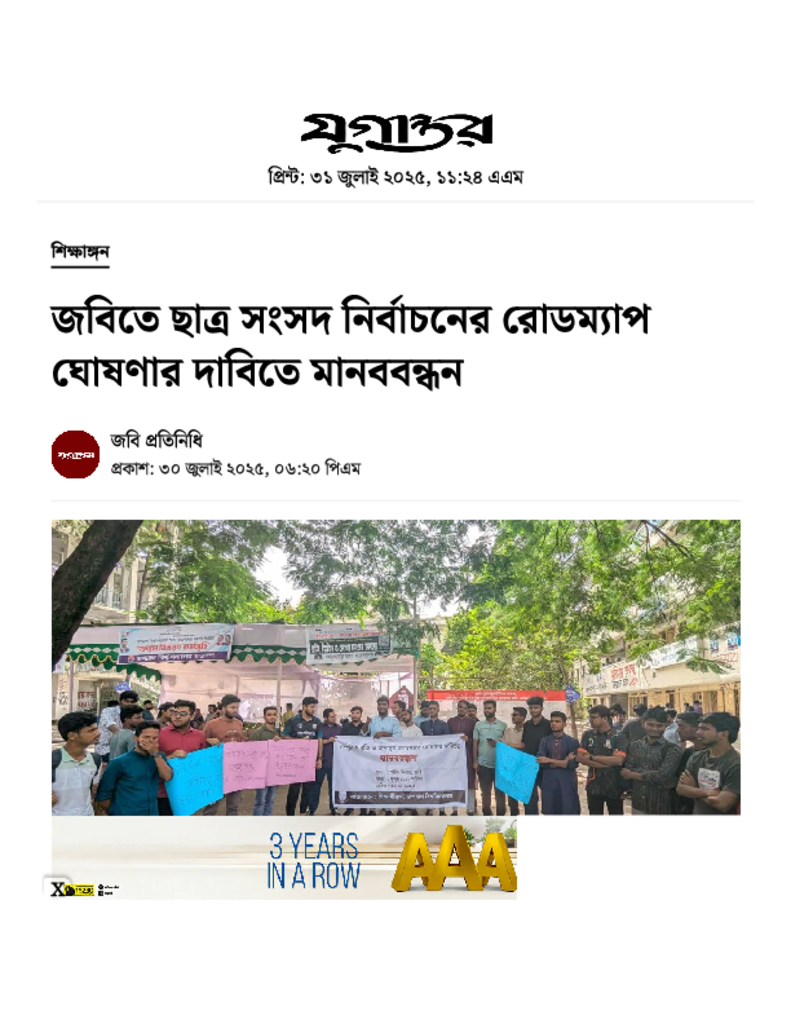 জবিতে ছাত্র সংসদ নির্বাচনের রোডম্যাপ ঘোষণার দাবিতে মানববন্ধন.pdf Published on 30 July 2025 Newspaper দৈনিক যুগান্তর Category Student Politics General Education Download
