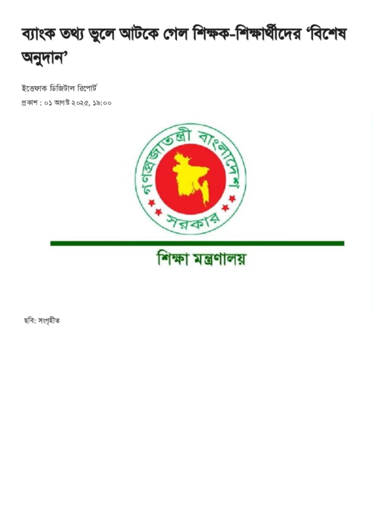 ব্যাংক তথ্য ভুলে আটকে গেল শিক্ষক-শিক্ষার্থীদের ‘বিশেষ অনুদান’.pdf Published on 01 August 2025 Newspaper দৈনিক ইত্তেফাক Category Personal Opinion / Discussion / Commentary Download