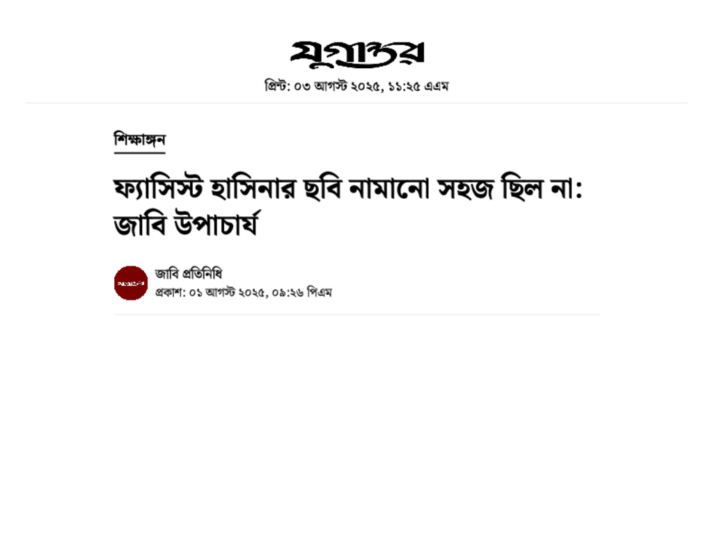 ফ্যাসিস্ট হাসিনার ছবি নামানো সহজ ছিল না_ জাবি উপাচার্য.pdf Published on 01 August 2025 Newspaper দৈনিক যুগান্তর Category Personal Opinion / Discussion / Commentary General Education Download