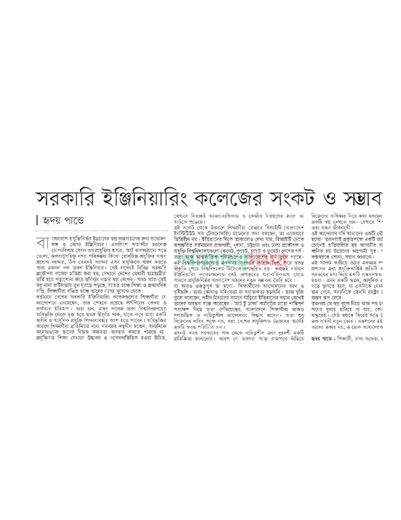 সরকারি ইন্জিনিয়ারিং কলেজের সংকট ও সম্ভাবনা.pdf Published on 02 August 2025 Newspaper দৈনিক আমাদের সময় Category Personal Opinion / Discussion / Commentary Download