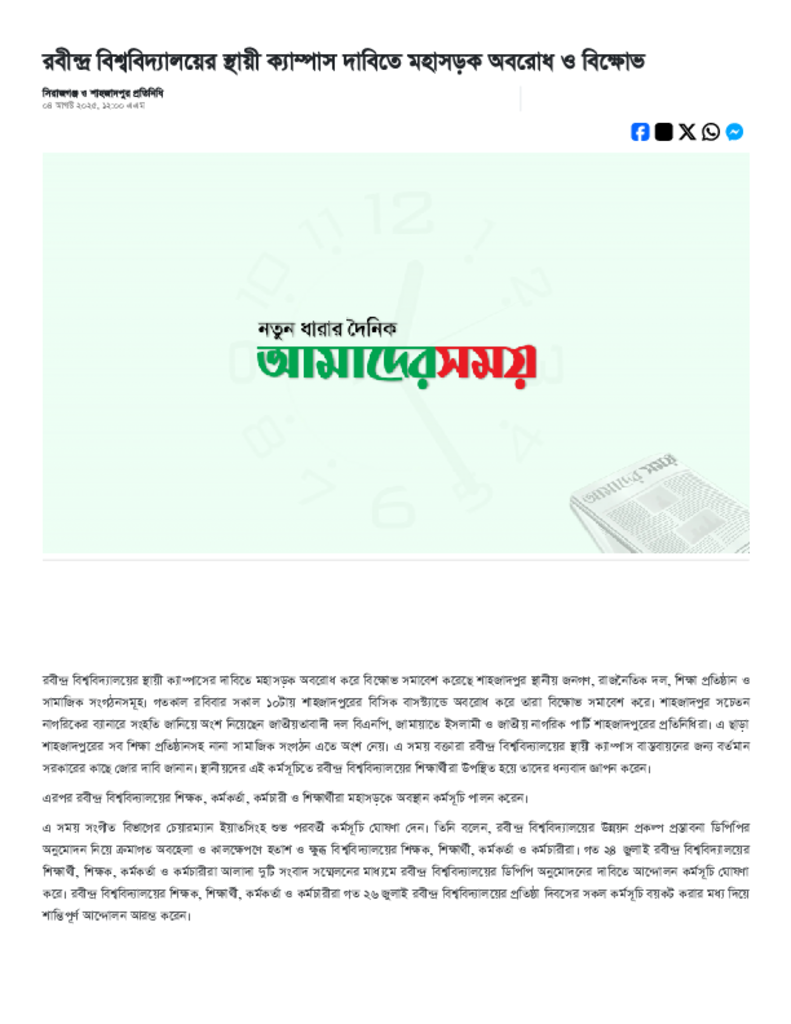 রবীন্দ্র বিশ্ববিদ্যালয়ের স্থায়ী ক্যাম্পাস দাবিতে মহাসড়ক অবরোধ ও বিক্ষোভ.pdf Published on 04 August 2025 Newspaper দৈনিক আমাদের সময় Category Others General Education Download