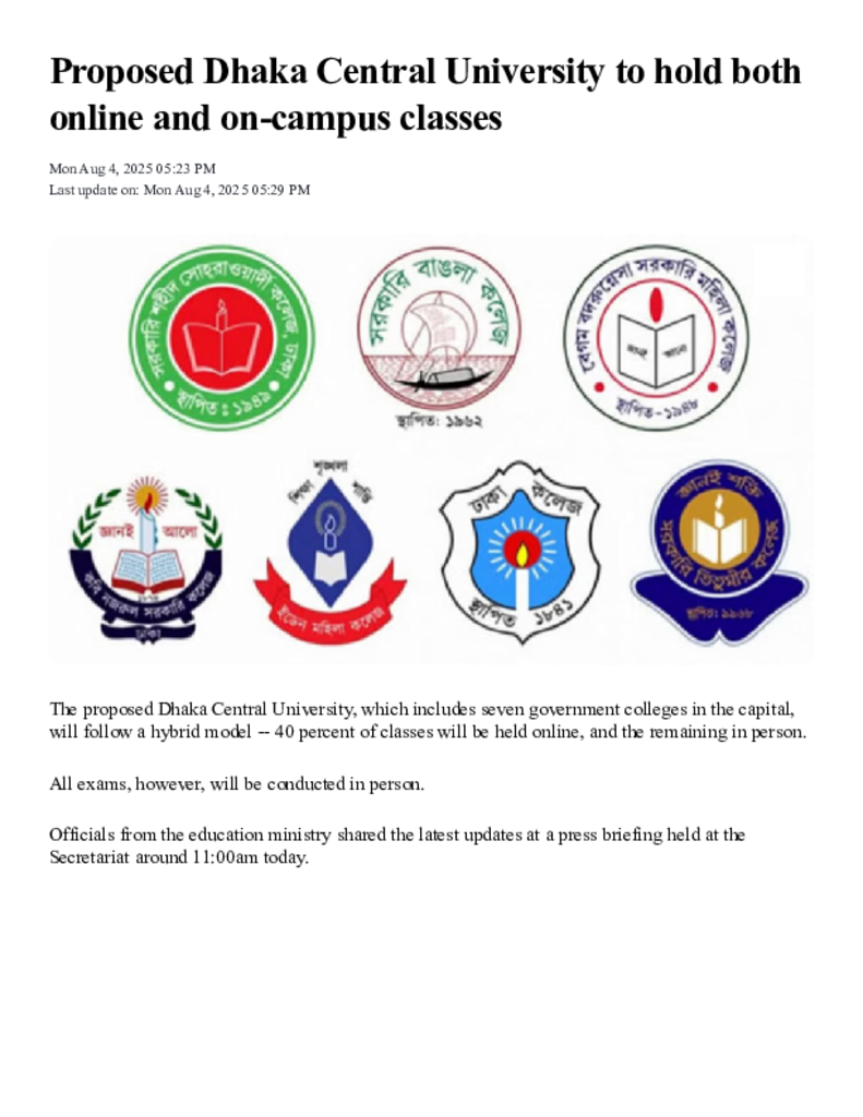 Proposed Dhaka Central University to hold both online and on-campus classes.pdf Published on 04 August 2025 Newspaper The Daily Star Category General Education General Education Download