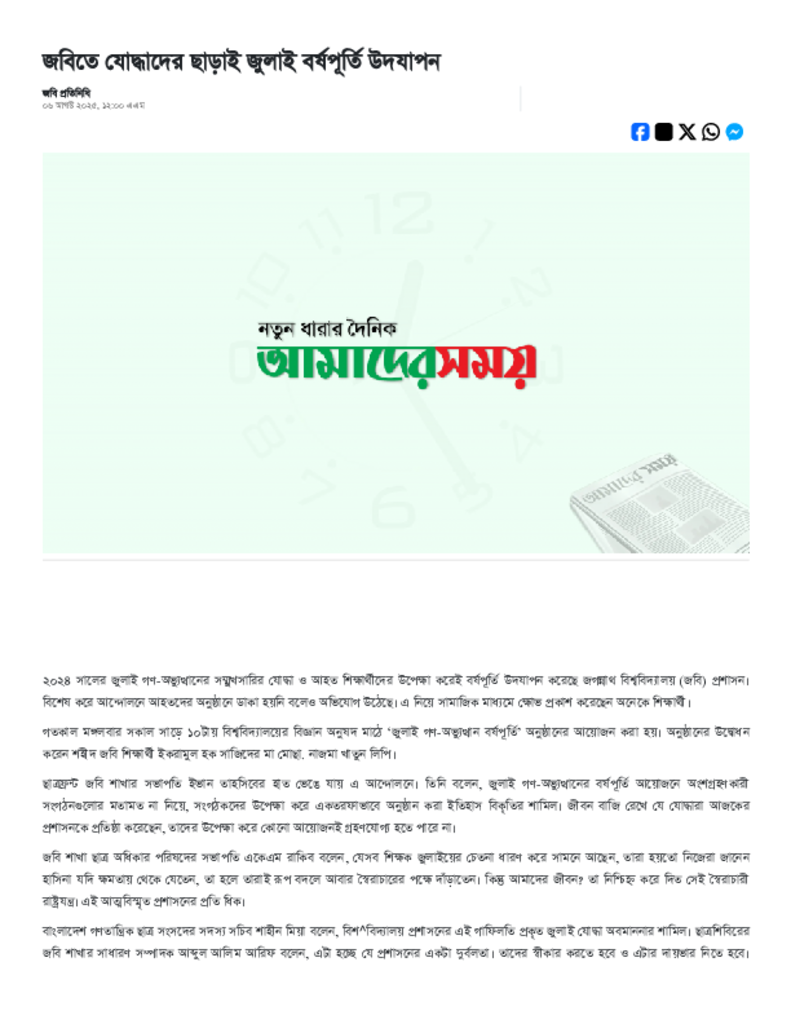 জবিতে যোদ্ধাদের ছাড়াই জুলাই বর্ষপূর্তি উদযাপন.pdf Published on 06 August 2025 Newspaper দৈনিক আমাদের সময় Category Personal Opinion / Discussion / Commentary General Education Download