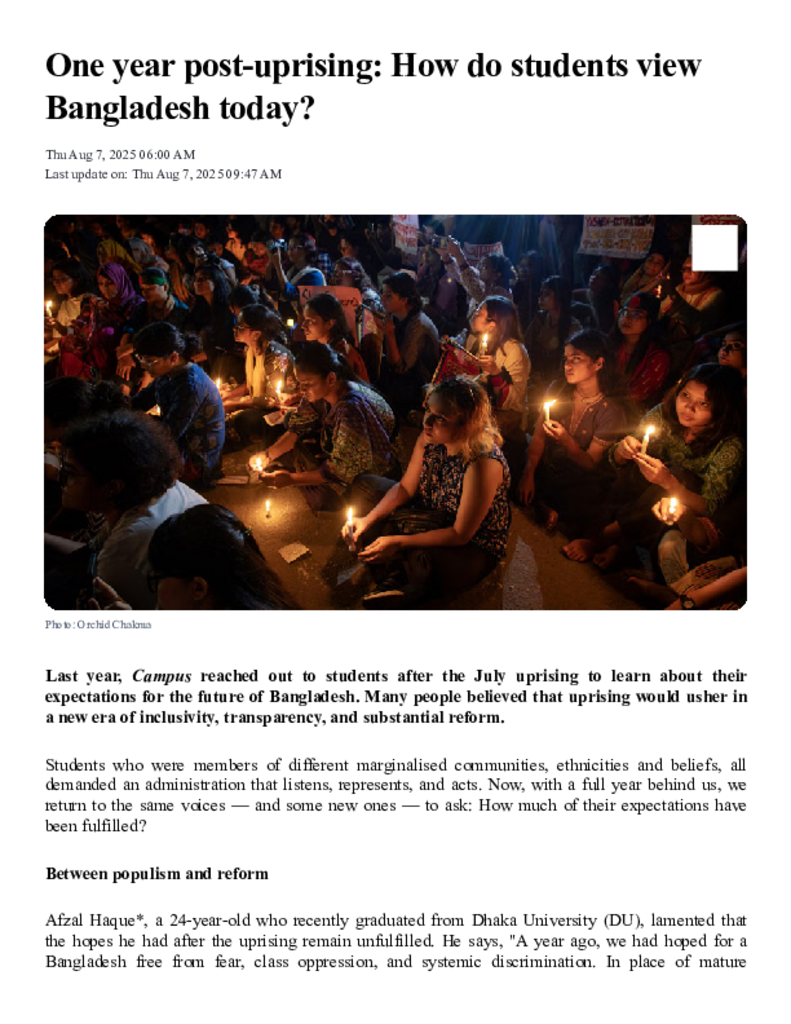 One year post-uprising- How do students view Bangladesh today.pdf Published on 07 August 2025 Newspaper The Daily Star Category Personal Opinion / Discussion / Commentary Download
