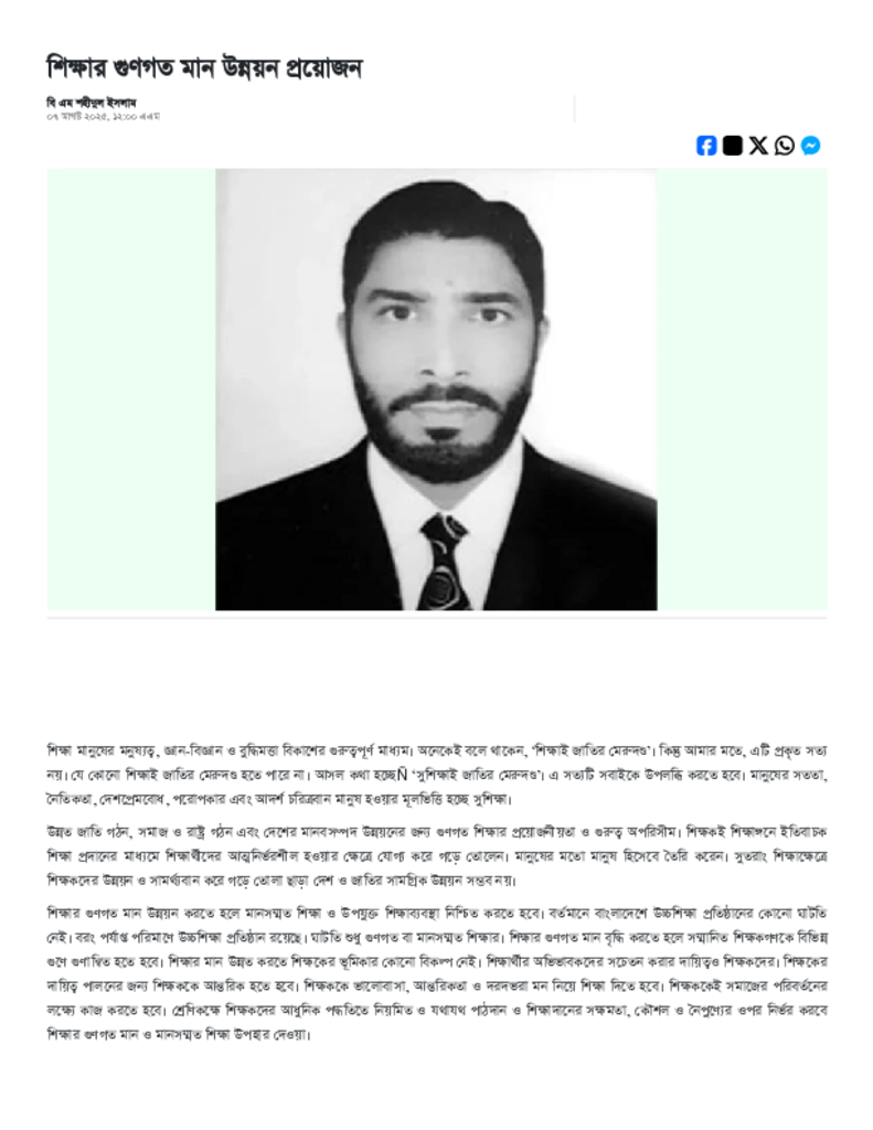 শিক্ষার গুণগত মান উন্নয়ন প্রয়োজন.pdf Published on 07 August 2025 Newspaper দৈনিক আমাদের সময় Category Personal Opinion / Discussion / Commentary Download