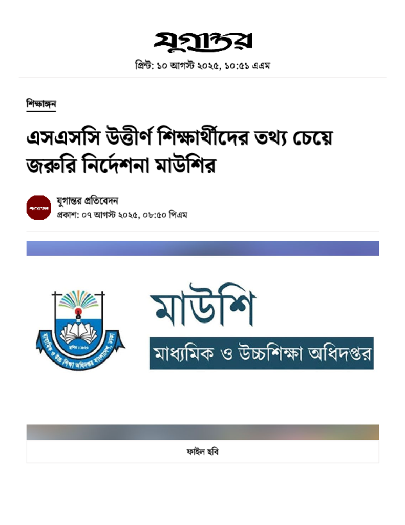 এসএসসি উত্তীর্ণ শিক্ষার্থীদের তথ্য চেয়ে জরুরি নির্দেশনা মাউশির.pdf Published on 07 August 2025 Newspaper দৈনিক যুগান্তর Category Educational Ministry / Departments Download