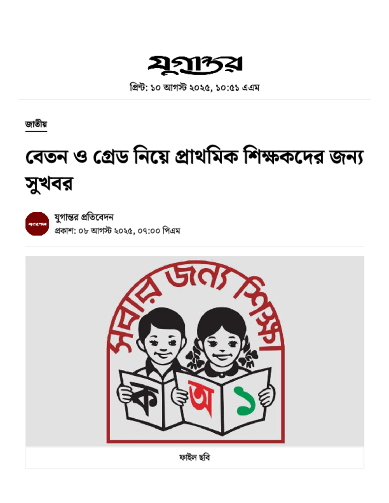 বেতন ও গ্রেড নিয়ে প্রাথমিক শিক্ষকদের জন্য সুখবর.pdf Published on 08 August 2025 Newspaper দৈনিক যুগান্তর Category Educational Ministry / Departments Education Ministry / Division / Directorate Download