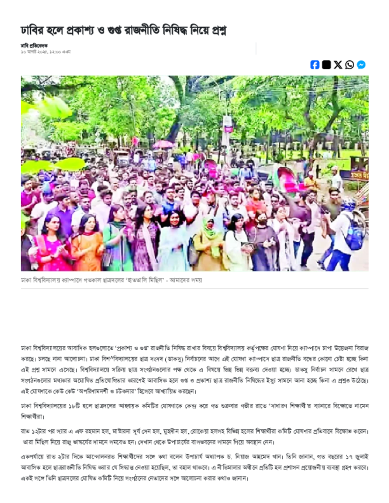 ঢাবির হলে প্রকাশ্য ও গুপ্ত রাজনীতি নিষিদ্ধ নিয়ে প্রশ্ন.pdf Published on 10 August 2025 Newspaper দৈনিক আমাদের সময় Category Student Politics Download