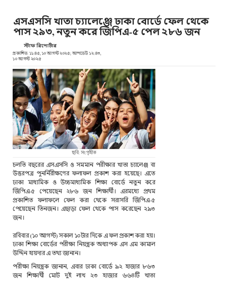 এসএসসি খাতা চ্যালেঞ্জে ঢাকা বোর্ডে ফেল থেকে পাস ২৯৩, নতুন করে জিপিএ-৫ পেল ২৮৬ জন.pdf Published on 10 August 2025 Newspaper দৈনিক জনকণ্ঠ Category Public Examination Public Examination SSC Download