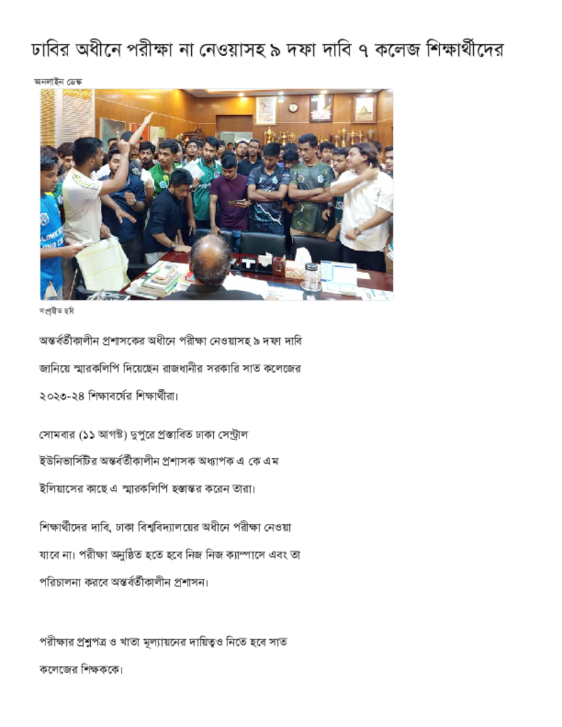 ঢাবির অধীনে পরীক্ষা না নেওয়াসহ ৯ দফা দাবি ৭ কলেজ শিক্ষার্থীদের.pdf Published on 11 August 2025 Newspaper দৈনিক কালের কন্ঠ Category Personal Opinion / Discussion / Commentary General Education Download