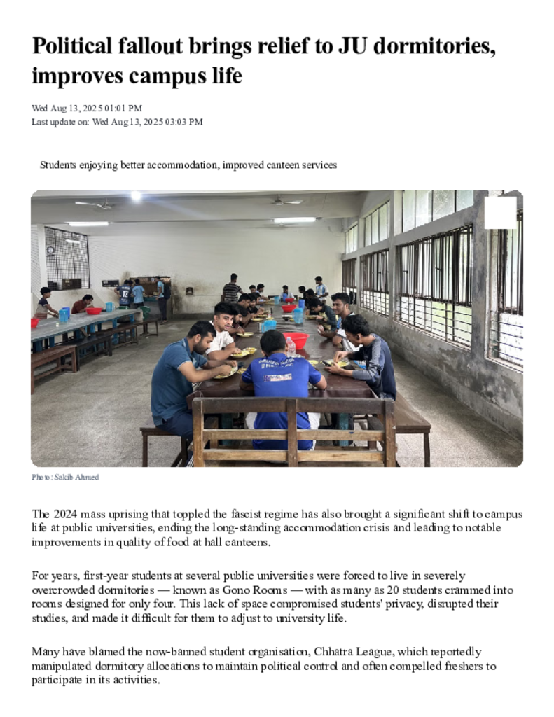 Political fallout brings relief to JU dormitories, improves campus life _ The Daily Star.pdf Published on 13 August 2025 Newspaper The Daily Star Category Personal Opinion / Discussion / Commentary General Education Download