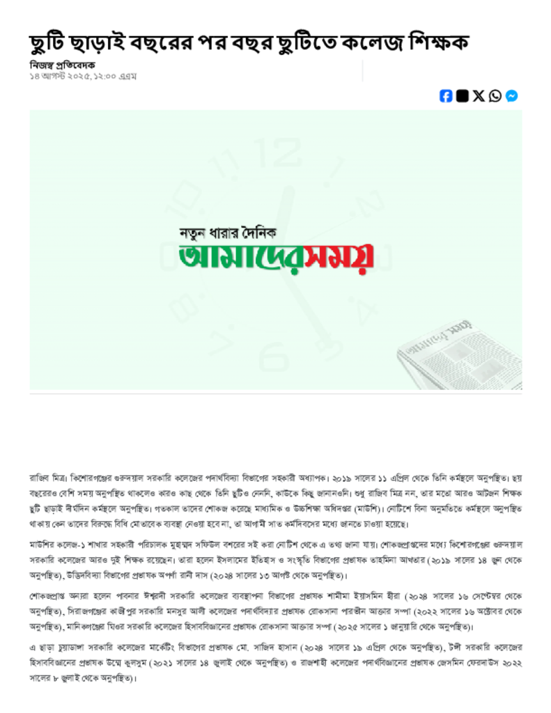 ছুটি ছাড়াই বছরের পর বছর ছুটিতে কলেজ শিক্ষক.pdf Published on 14 August 2025 Newspaper দৈনিক আমাদের সময় Category Personal Opinion / Discussion / Commentary Download