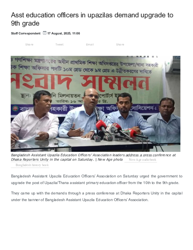 New Age _ Asst education officers in upazilas demand upgrade to 9th grade.pdf Published on 17 August 2025 Newspaper New Age Category Educational Ministry / Departments Education Ministry / Division / Directorate Download