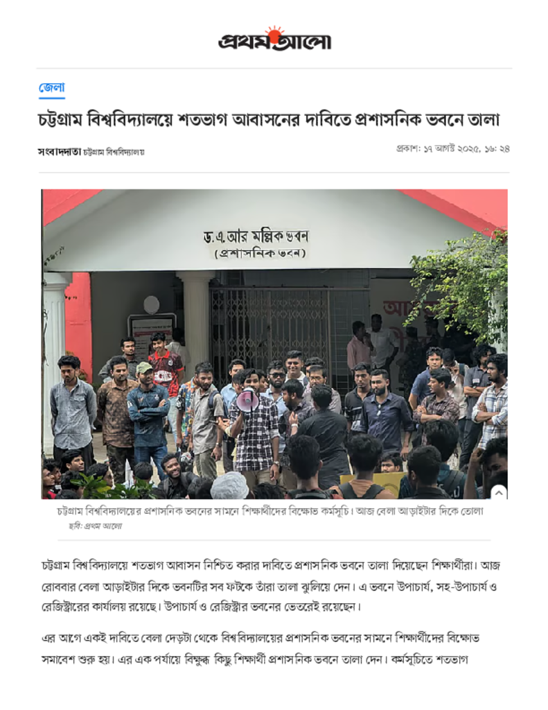 চবিকে শতভাগ আবাসিক করার দাবিতে শিক্ষার্থীদের বিক্ষোভ _ প্রথম আলো.pdf Published on 17 August 2025 Newspaper দৈনিক প্রথম আলো Category Personal Opinion / Discussion / Commentary General Education Download