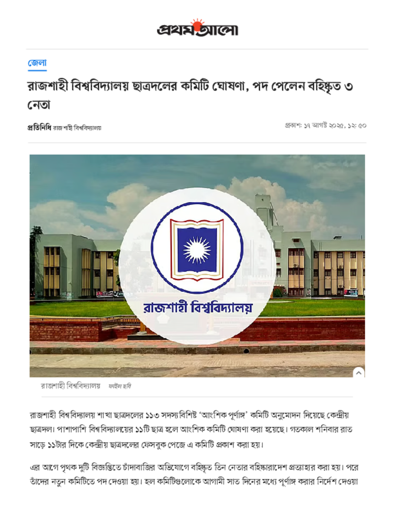রাজশাহী বিশ্ববিদ্যালয় ছাত্রদলের কমিটি ঘোষণা, পদ পেলেন বহিষ্কৃত ৩ নেতা.pdf Published on 17 August 2025 Newspaper দৈনিক প্রথম আলো Category Student Politics General Education Download
