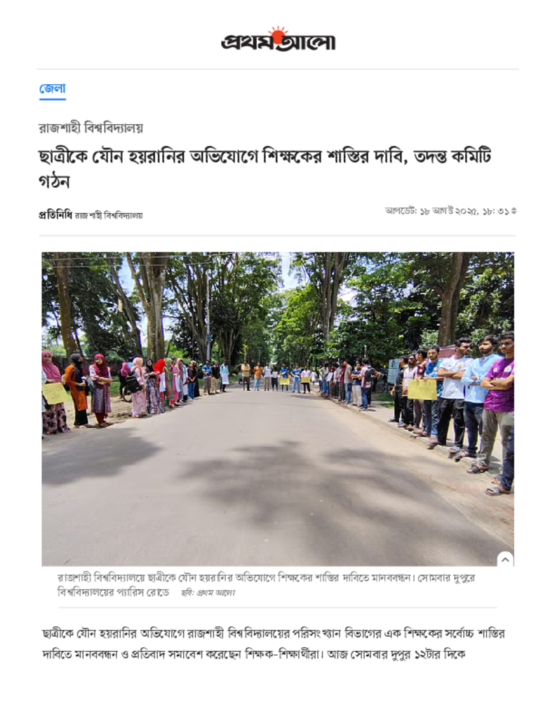 ছাত্রীকে যৌন হয়রানির অভিযোগে শিক্ষকের শাস্তির দাবি, তদন্ত কমিটি গঠন.pdf Published on 18 August 2025 Newspaper দৈনিক প্রথম আলো Category Others General Education Download