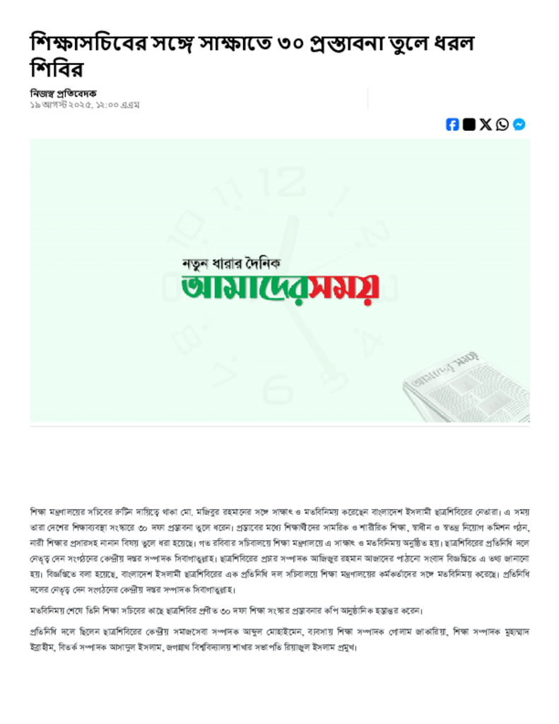 শিক্ষাসচিবের সঙ্গে সাক্ষাতে ৩০ প্রস্তাবনা তুলে ধরল শিবির.pdf Published on 19 August 2025 Newspaper দৈনিক আমাদের সময় Category Personal Opinion / Discussion / Commentary General Education Download