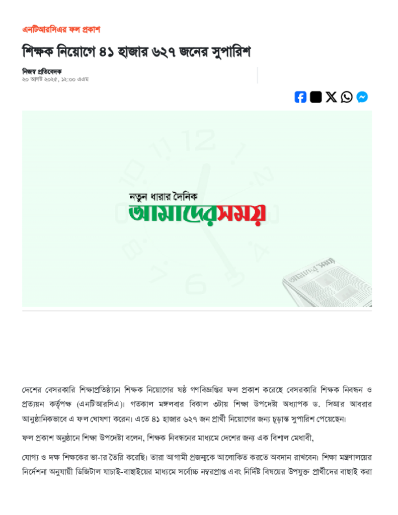 শিক্ষক নিয়োগে ৪১ হাজার ৬২৭ জনের সুপারিশ.pdf Published on 20 August 2025 Newspaper দৈনিক আমার দেশ Category Educational Ministry / Departments Download