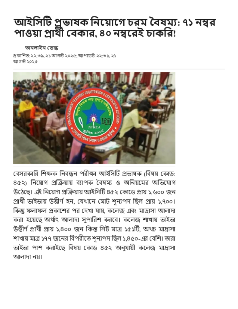 আইসিটি প্রভাষক নিয়োগে চরম বৈষম্য_ ৭১ নম্বর পাওয়া প্রার্থী বেকার, ৪০ নম্বরেই চাকরি!.pdf Published on 21 August 2025 Newspaper দৈনিক জনকণ্ঠ Category ICT Education Download