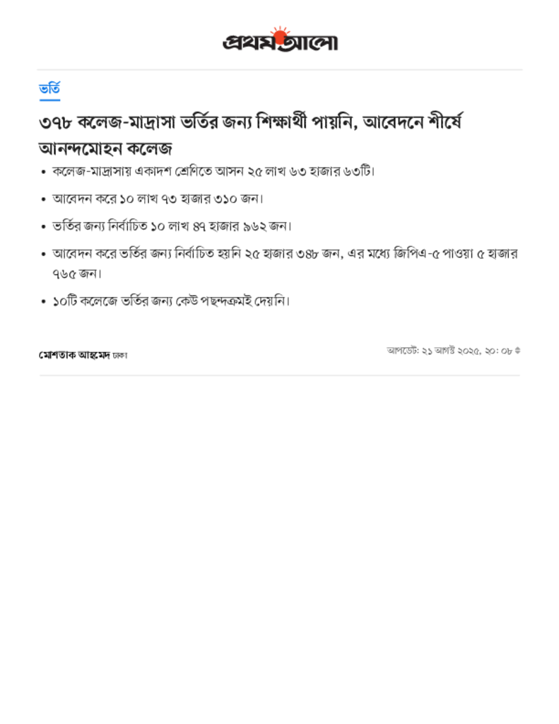 ৩৭৮ কলেজ-মাদ্রাসা ভর্তির জন্য শিক্ষার্থী পায়নি, আবেদনে শীর্ষে আনন্দমোহন কলেজ.pdf Published on 21 August 2025 Newspaper দৈনিক প্রথম আলো Category Admission / Seat Problem General Education Download