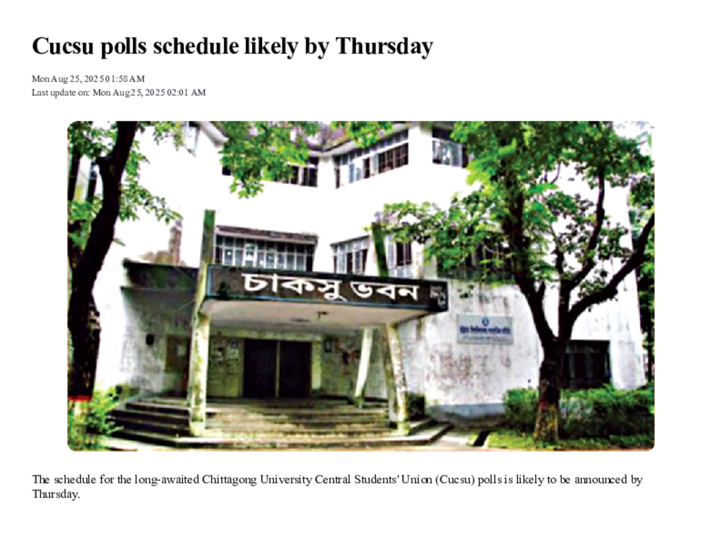 Cucsu polls schedule likely by Thursday _ The Daily Star.pdf Published on 25 August 2025 Newspaper The Daily Star Category Student Politics General Education Download