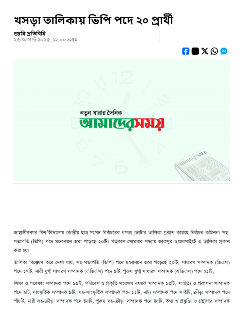 খসড়া তালিকায় ভিপি পদে ২০ প্রার্থী.pdf Published on 26 August 2025 Newspaper দৈনিক আমাদের সময় Category Student Politics General Education Download