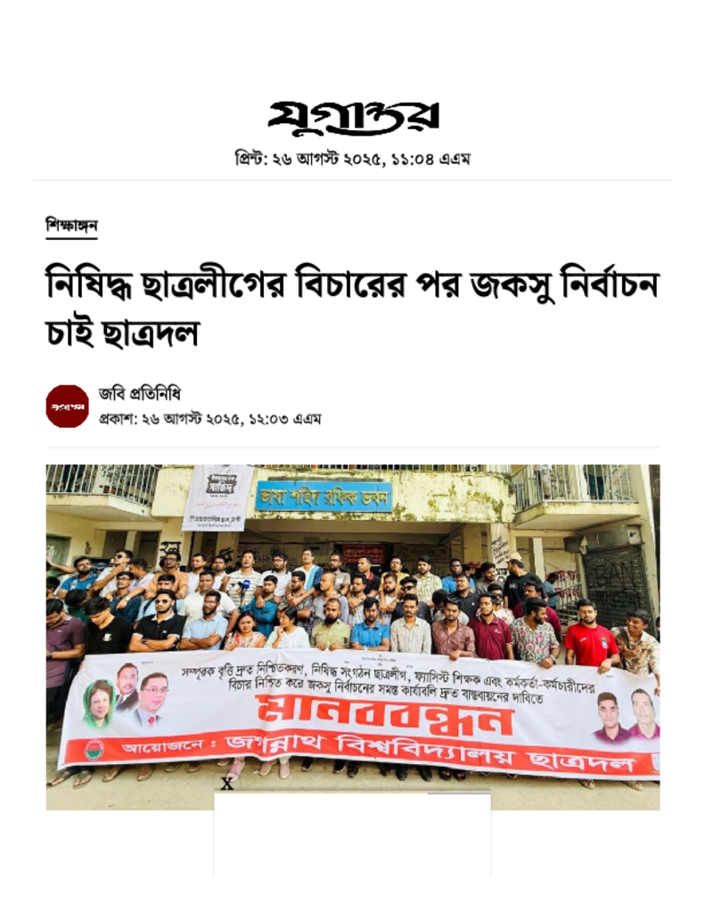 নিষিদ্ধ ছাত্রলীগের বিচারের পর জকসু নির্বাচন চাই ছাত্রদল.pdf Published on 26 August 2025 Newspaper দৈনিক যুগান্তর Category Student Politics General Education Download