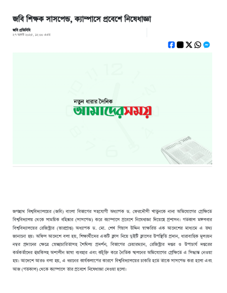 জবি শিক্ষক সাসপেন্ড, ক্যাম্পাসে প্রবেশে নিষেধাজ্ঞা.pdf Published on 27 August 2025 Newspaper দৈনিক আমাদের সময় Category Educational Ministry / Departments General Education Download
