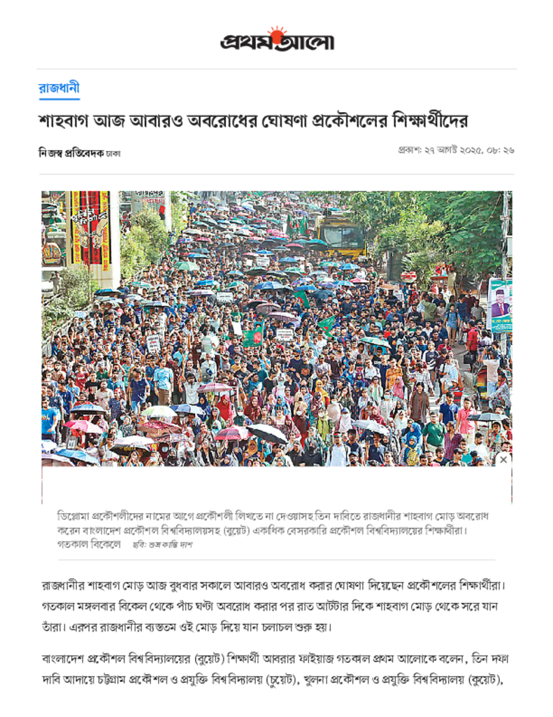শাহবাগ আজ আবারও অবরোধের ঘোষণা প্রকৌশলের শিক্ষার্থীদের.pdf Published on 27 August 2025 Newspaper দৈনিক প্রথম আলো Category Others General Education Download