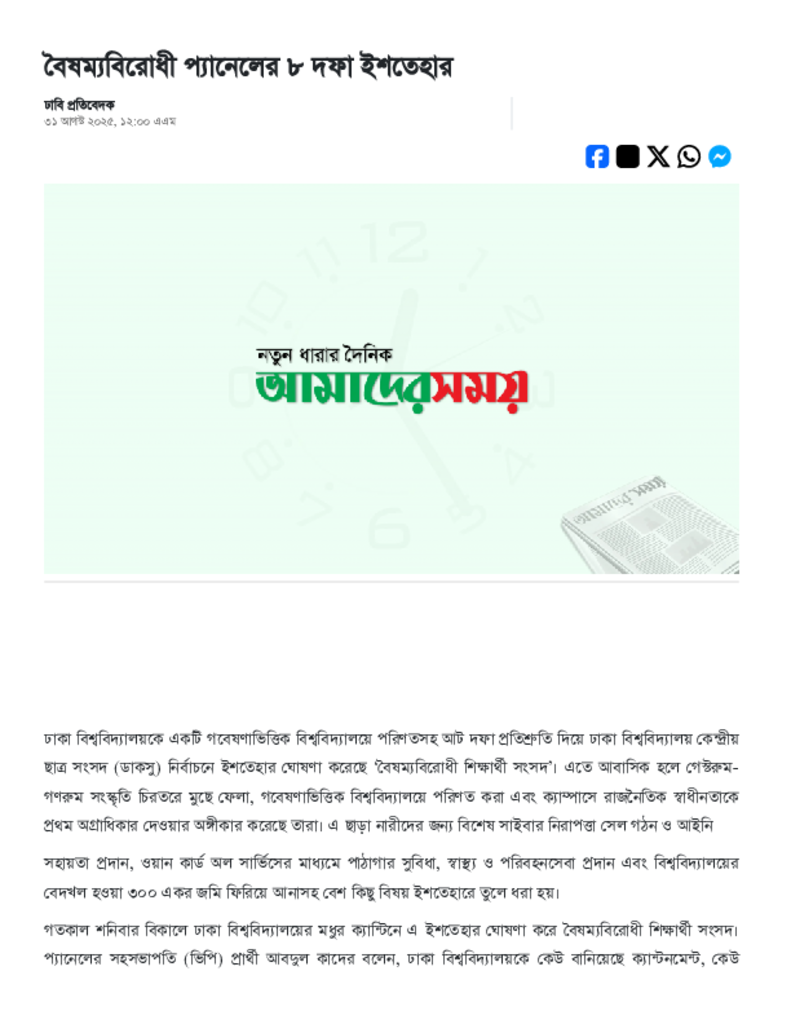 বৈষম্যবিরোধী প্যানেলের ৮ দফা ইশতেহার.pdf Published on 31 August 2025 Newspaper দৈনিক আমাদের সময় Category Student Politics General Education Download