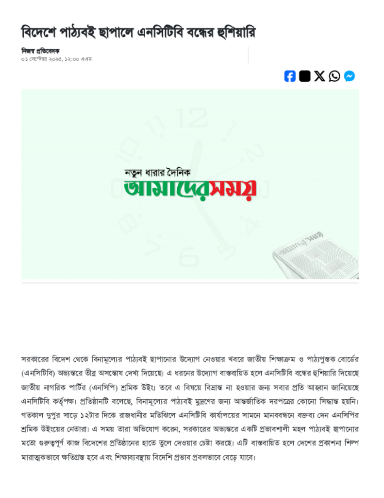 বিদেশে পাঠ্যবই ছাপালে এনসিটিবি বন্ধের হুশিয়ারি.pdf Published on 01 September 2025 Newspaper দৈনিক আমাদের সময় Category Personal Opinion / Discussion / Commentary Download
