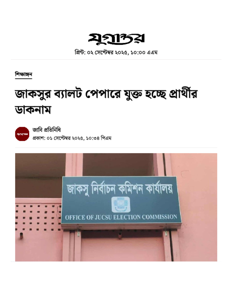 জাকসুর ব্যালট পেপারে যুক্ত হচ্ছে প্রার্থীর ডাকনাম.pdf Published on 01 September 2025 Newspaper দৈনিক যুগান্তর Category Student Politics General Education Download
