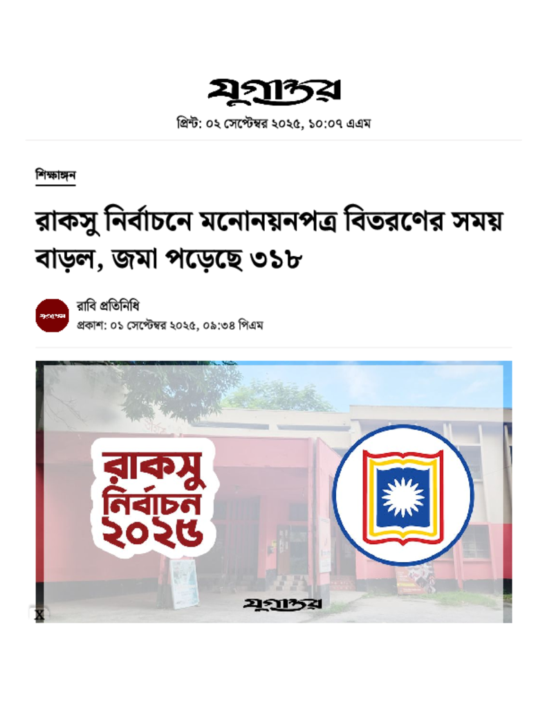 রাকসু নির্বাচনে মনোনয়নপত্র বিতরণের সময় বাড়ল, জমা পড়েছে ৩১৮.pdf Published on 01 September 2025 Newspaper দৈনিক যুগান্তর Category Student Politics General Education Download